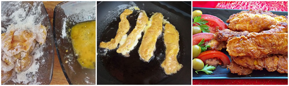 Prije pečenja ostavite meso barem pola sata na sobnoj temperaturi.Pripremite zdjele sa jajem i brašnom.Stavljate trakice iz marinade prvo u brašno a potom u jaje.Pržite u plitkoj masnoći.Ocijedite na papiru za pečenje/iako doista ne popije ulje/.